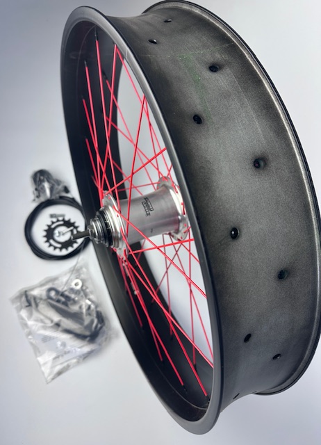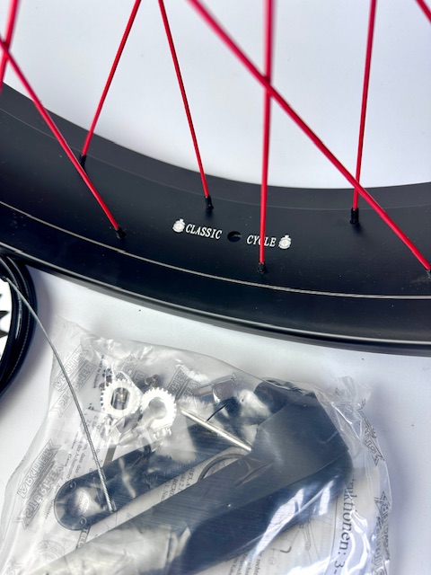 36 x 2 mm radios en rojo, racor negro, llanta de aluminio de pared doble 102 mm, negro mate, rueda trasera, llanta de aluminio 102 mm, radios en rojo, Sturmey Archer 3 velocidades para freno de disco, puño giratorio, palanca de cambios con cable de 2200 mm